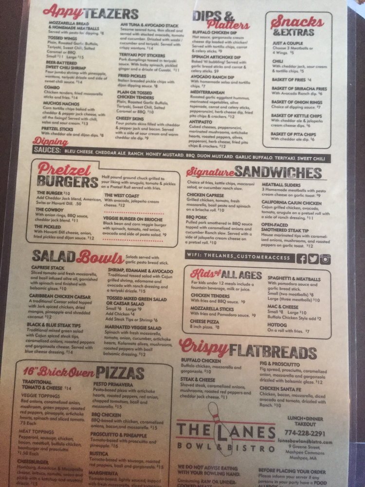 The Lanes Bowl and Bistro, located in Mashpee, MA, offers a diverse menu with a focus on American bar food. From appetizers like the Ani Tuna and Avocado Stack to Chargrilled Burgers like The Avo Ranch Cajun Burger, there are options for every palate. Customer reviews praise the variety of food choices, with favorites being the chicken wings, meatball appetizer, and BBQ Pulled Pork Nachos. The venue also offers a range of amenities such as live music, outdoor seating with games, and bowling options, making it a great spot for group gatherings. While some reviewers noted slow service, overall, The Lanes Bowl and Bistro provides a fun and casual dining experience with reasonable prices and good food options. The outdoor setting and diverse menu make it a convenient and enjoyable stop for both locals and visitors to Mashpee Commons.